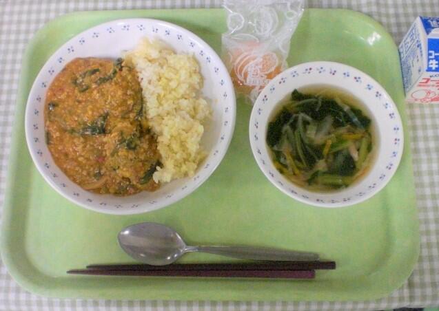 今日の給食は洋食です。主食はほうれん草と豚肉のドライカレーです。ドライカレーは普通のカレーと違い、具材を全てみじん切りにしています。また、お肉も挽き肉で、全体的に細かく、ご飯と合わせて食べやすいです。そして、仕上げにほうれん草10kg入れました。ほうれん草は中学生に特に必要な鉄分や免疫力アップなどの効果があるビタミンCが豊富です。ほうれん草を加えることで、色味も栄養価もアップしています。美味しくできたので、ぜひしっかり食べてもらえたらと思います。