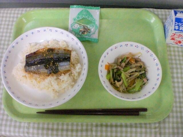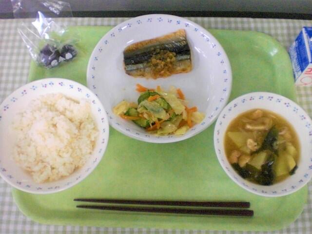 今日の献立は、和食です。主菜は、さんまのねぎダレがけです。岩手県でとれたさんまを使っています。さんまは秋が旬の魚です。しょうゆベースのタレに刻んだねぎをたっぷり加えてねぎダレをつくり、ふっくらと焼いたさんまにかけて仕上げました。さんまなどの青魚は、独特のくさみがあるのですが、下味で、しょうが、酒を使い、さらにねぎダレで比較的食べやすくなっています。栄養もあるので、ぜひしっかり食べてもらえたらと思います。