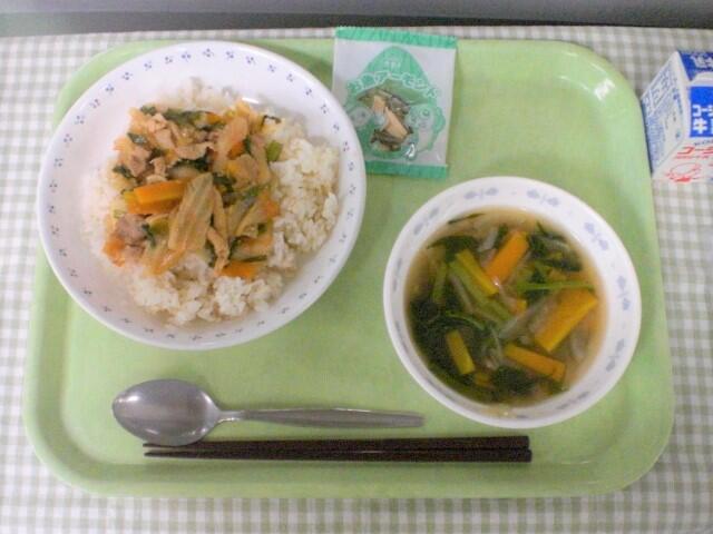今日の主食は豚キムチ丼です。具材にお肉、キムチ以外にもにんじん、玉ねぎ、たけのこ、にらが入っています。キムチのピリ辛な味付けとお肉のうま味が食欲を誘います。ご飯は体のエネルギー源でもあるので、しっかり食べてほしいです。また、汁物は水分、塩分補給にもなるため、合わせてきちんと食べてもらえたらと思います。
