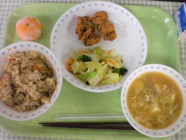 今日の給食は和食です。主菜は、大人気のとりの唐揚げです。給食の唐揚げは、小麦粉だけでなく、米粉も使っています。米粉を合わせることで、油を吸いにくくなり、カリッと揚がります。調理員さんの揚げる技術があるため、今日の唐揚げも外はカリッと、中はジューシーに仕上がっています。手間暇かけて作っているので、ぜひ残さず食べてもらえたらと思います。