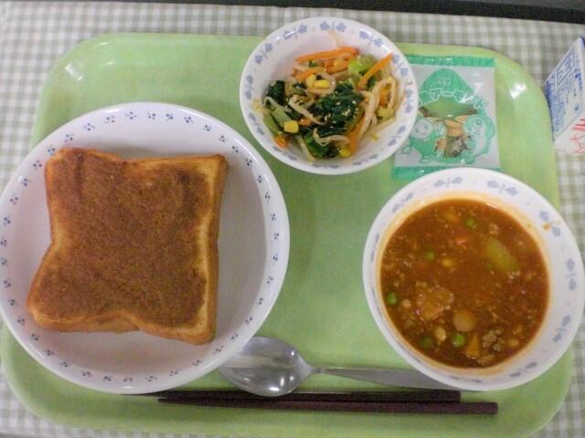 今日の献立は、洋食です。主食は、きな粉トーストです。きな粉はそもそも何が原料かというと、大豆からできています。そのため、畑の肉と言われるほど栄養価のある大豆と同じようにきな粉にも栄養があります。体をつくる良質なたんぱく質やお腹の調子を整える食物繊維、美肌効果などのあるイソフラボン等、様々な栄養が含まれています。きな粉、マーガリン、きび砂糖とシンプルな味付けですが、揚げパンに似た味でパンとの相性はバッチリです。美味しく出来ました。