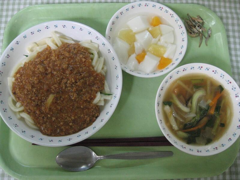 今日の献立は、中華です。主食は、ジャージャーうどんです。ジャージャー麺のうどんバージョンにしました。ジャージャー麺は中国の山東省でよく作られる家庭料理です。中国語だと、ジャージャー麺は肉みそ麺という意味の漢字で表記されます。今日のジャージャーうどんの肉みそは、豚肉のひき肉を主に、大豆、ネギ、玉ねぎ、にんじん、しいたけなど細かくし、合わせて炒めて、みそで味をつけし、肉みそにしました。今日は、気温が上がるそうなので、煮込みうどんではなく、食べやすい冷麺にしたので、しっかり食べてもらえたらと思います。