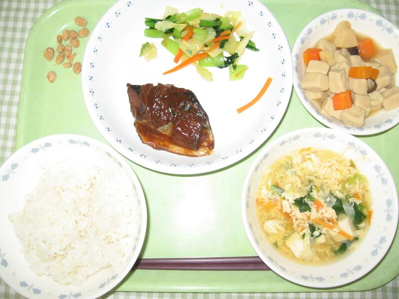 今日の献立は、中華です。主食は麻婆豆腐飯です。豆腐を1人あたり、120g、全体では52kgと大量に使ってつくりました。豆腐には、大豆のたんぱく質が豊富に含まれており、畑の肉と言われるほどの栄養価です。また、レシチンとコリンという栄養素は、記憶力を高め、脳の活性化に効果があるとされています。他にも、骨や歯の構成成分であるカルシウムや、腸内の善玉菌を増やす働きのあるオリゴ糖などの栄養素が含まれています。今日は、ねぎ、にんじんなど野菜たっぷり、お肉たっぷりな麻婆豆腐になっています。みそをきかせて味付けしているので、風味もよく美味しく仕上がりました。