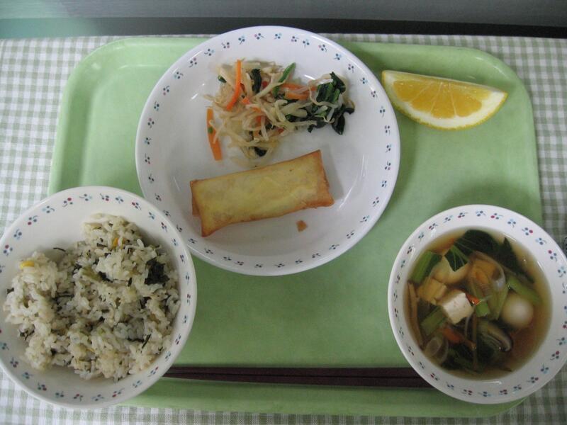 いよいよ明日から林間学校です。そのため、今日は、林間で行く長野県を意識した林間へいってらっしゃい献立です。まず主食は、長野県の名物、野沢菜を使った野沢菜ごはんです。野沢菜としらすをご飯に混ぜ合わせました。野沢菜のほどよい塩気でご飯がすすみます。ぜひもりもり食べてくださいね!