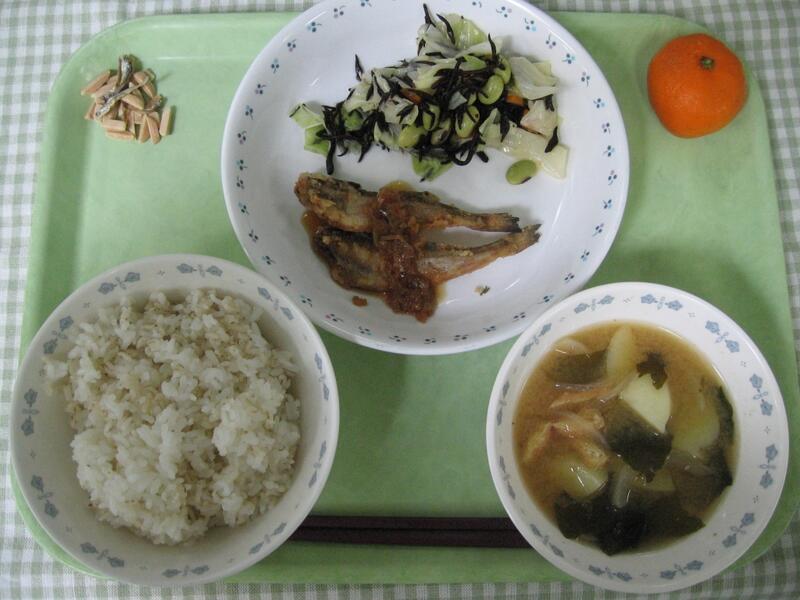 今日の給食は和食です。主菜ははたはたのから揚げねぎソースです。そもそもはたはたの名前は、鳴りとどろく雷、いかずちを意味する「はたたがみ」に由来するとされています。これははたはたが産卵のため沿岸に押し寄せてくる11~12月頃は雪が降る前に雷がなることが多いからだそうです。そんなはたはたですが、疲労回復に役立つビタミンB1や皮ふや粘膜の機能維持や成長に役立つビタミンB2、脳神経を正常に働かせるのに役立つナイアシンやビタミンB6などたくさんの栄養が含まれています。下味をつけて揚げ、さらにねぎソースをかけたことで食べやすくなっているので、魚が苦手な人もチャレンジしてもらえたらと思います。
