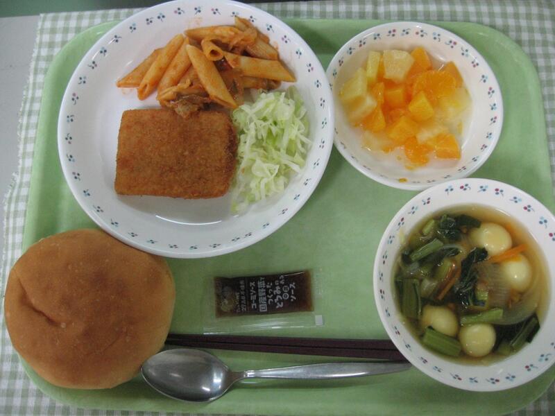 今日の給食は、洋食です。副菜はペンネトマトソースです。ペンネ、豚肉、玉ねぎ、ピーマンを炒めて、味付けはトマトケチャップとトマトを加えて整えました。ペンネはパスタの一種であり、イタリアのシチリア州などでよく食べられており、ペン先のように斜めに切られた特徴的なパスタになっています。ソースにからみやすいので、味がしっかり感じられて美味しいです。ぜひしっかり食べてくれたらと思います。