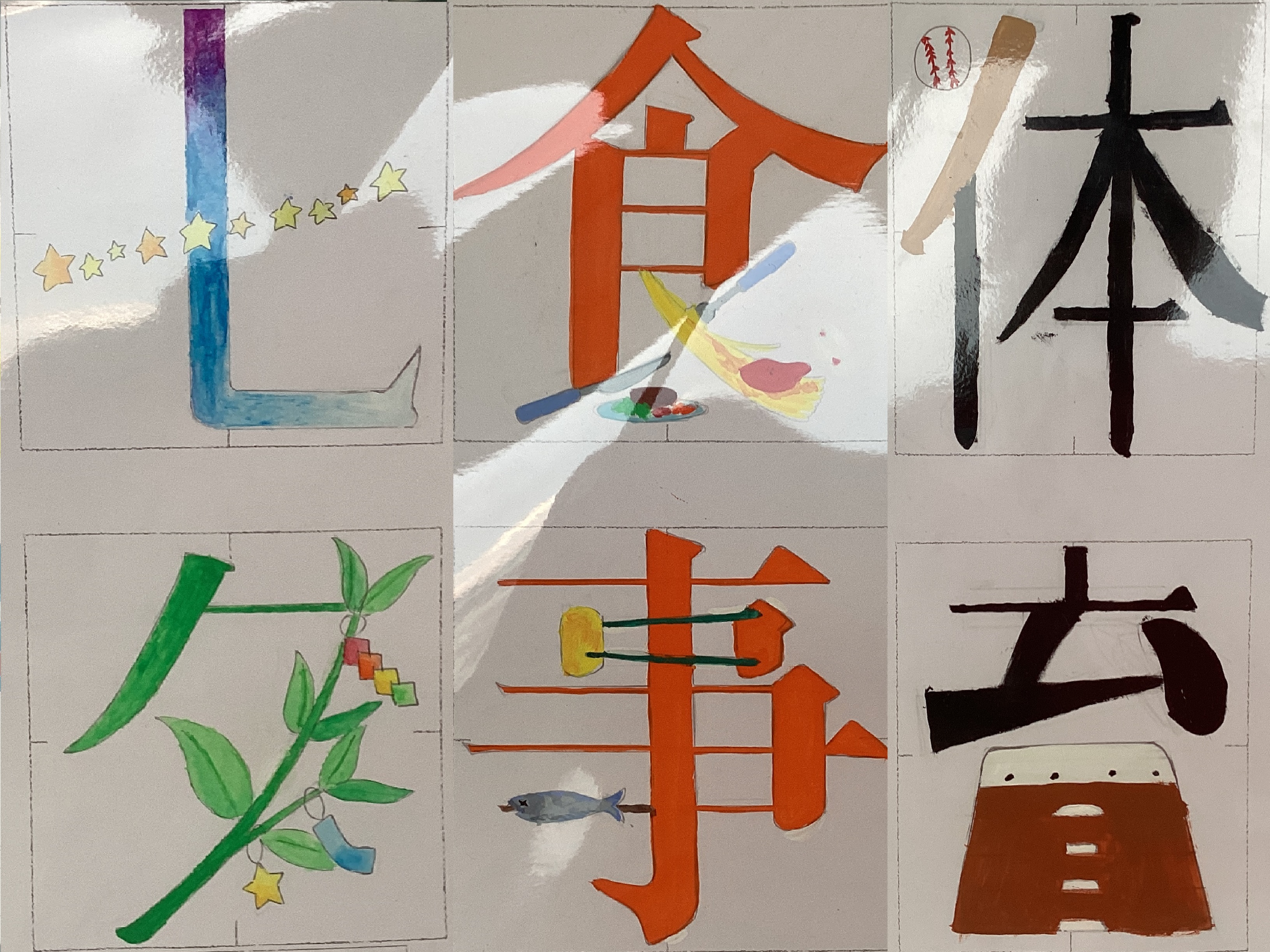 には美術の授業で作ったレタリングの作品が飾られて