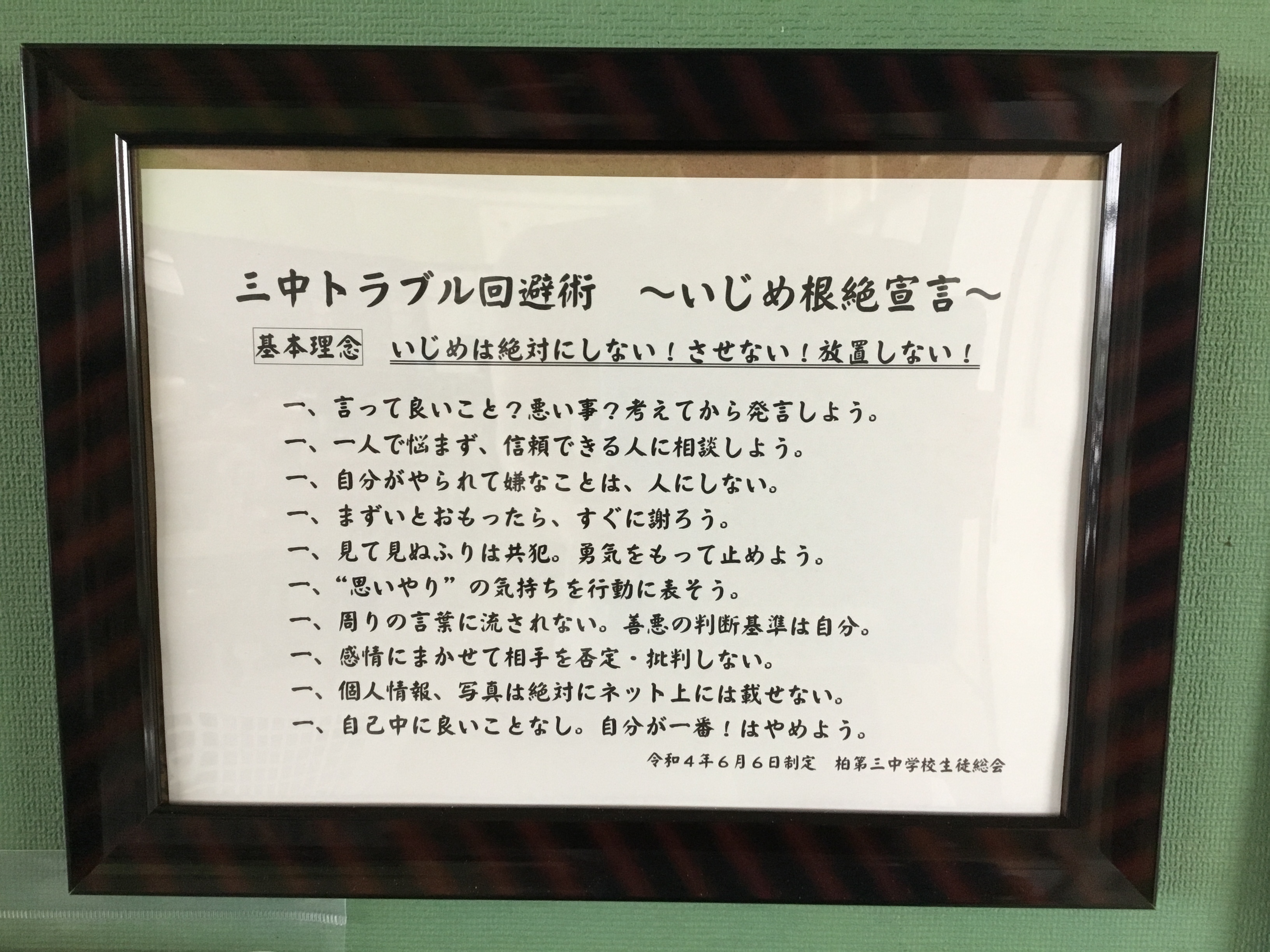 立派な額縁に入った状態で飾られており、校内全体にいじめはダメ
