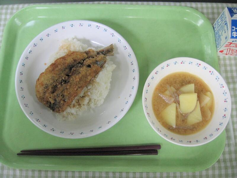 今日の主食のいわしの蒲焼き丼は、いわしの開きを丸々1匹使い、骨までしっかり揚がっているため、カルシウムたっぷり、全部食べることができます。食感もしっかりしていたので、よく噛んでくれたかなと思います。