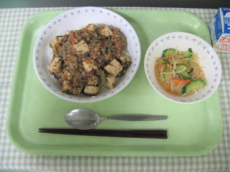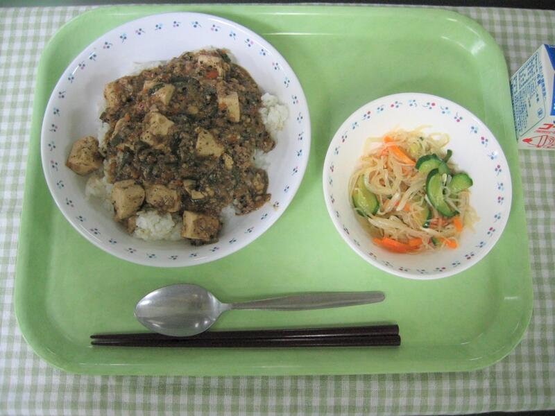 今日の主食は、黒麻婆豆腐丼です。「黒」というのは、辛いというような意味合いではなく、黒ごまが使われているからです。昨日もごまの栄養について紹介しましたが、ごまは栄養たっぷりです。また、味も普通の麻婆豆腐とは少し変わり、ごまが入ると風味よく仕上がります。