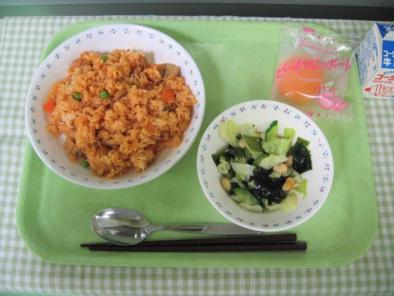 今日の献立は、洋食です。主食はチキンピラフです。その名の通り、鶏肉を使い、玉ねぎ、にんじん、マッシュルーム、コーン、グリンピースなどの具材を混ぜ合わせて作りました。味つけとしては、トマトペースト、トマトケチャップが多く使われていますが、調理員さんが丁寧にしっかり火を通してくれたお陰で、酸味がある程度とび、風味は残しつつ、食べやすいまろやかな味になっています。