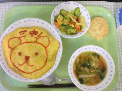 今日の主食は、セルフチキンオムライスです。鶏肉をたっぷり使ったチキンライスにエッグシートをのせ、小袋のケチャップをかけて食べます。自分で好きなものを書いても面白いと思います。そして、デザートは紅茶スコーンです。アールグレイの茶葉をしっかり使った香りのよい人気の美味しいデザートです。見た目も味も楽しめるように考えたメニューで、調理員さんたちも丁寧に、一生懸命作ってくれました。ぜひもりもり食べてもらえたらと思います。