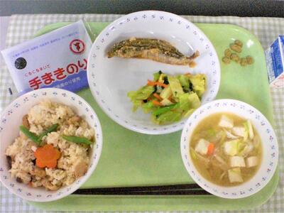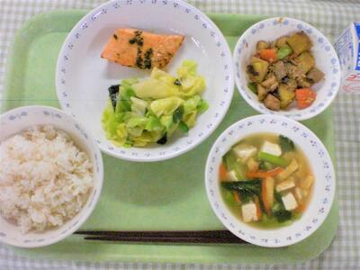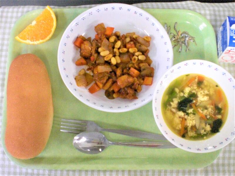 今日の献立は、洋食です。主菜は、鶏肉と大豆のトマト煮です。玉ねぎ、にんじん、大豆をトマトやケチャップで煮込み、そこにカリッと揚げた鶏肉入れて仕上げた、トマトの旨味がつまった煮込み料理です。また、鶏肉にも大豆にも体をつくるため、免疫力を高めるために必要なたんぱく質が豊富に含まれています。そして、野菜もしっかり入るので、体の調子を整えるビタミン類もとれます。ぜひしっかり食べてもらえたらと思います。