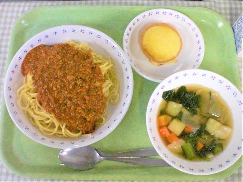 さて、今日の献立は洋食です。主食はスパゲティミートソースです。1時間以上よく煮込んだミートソースは、お肉と野菜の旨味がたっぷりつまっています。また、お肉と野菜以外にも大豆のみじん切りが入っているのですが、ミートソースに入ると大豆特有の風味がなくなり、豆が苦手な人でもかなり食べやすいです。美味しくて、栄養もとれるスパゲッティなので、ぜひもりもり食べてもらえたらと思います。