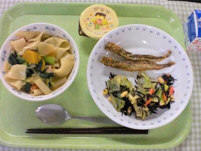 さて、今日の献立は、日本縦断献立第四弾、山梨県献立です。主食は、山梨の郷土料理である「ほうとう」です。山梨県の山間部では米作りがむずかしく、その代わりに麦で栽培していました。その麦を麺にして、季節の野菜といっしょにみそで煮こんで食べたのがほうとうです。戦国時代の武将、武田信玄が自分の刀で食材を切ったことから、「宝刀」と名付けられたという説もあります。