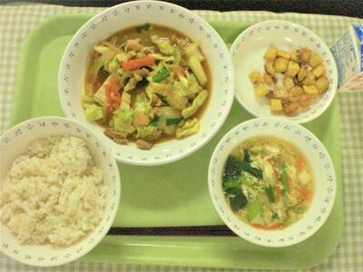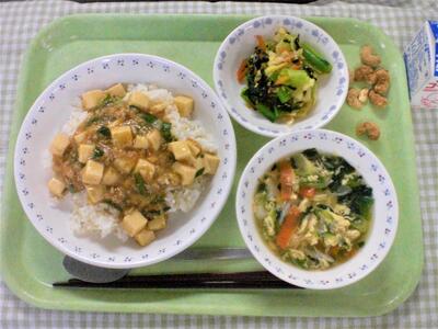 さて、今日の献立は、中華です。主食は、麻婆豆腐丼です。豆腐には、体をつくるたんぱく質が豊富に含まれており、他にも記憶力アップのレシチンやコリン、骨をつくるカルシウムなど様々な栄養が含まれています。そんな豆腐を今日はたっぷり48キロ使って作っています。三中の麻婆豆腐は味噌たっぷりで、コクのある味付けになっています。ぜひご飯と一緒にもりもり食べてもらえたらと思います。