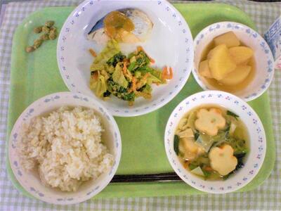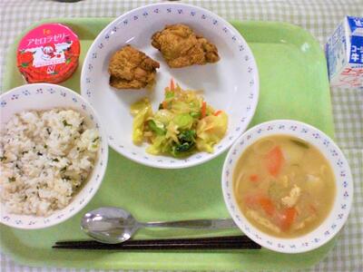 今日の献立は、和食です。主菜は、とりの唐揚げです。これは、11月12日に行われた食育集会で、クイズ給食王で見事1位を獲得した2年4組さんのリクエストです。生徒たちだけでなく、先生方からも人気なメニューの1つです。今日の唐揚げも下味がしっかり、にんにくのきいた、カリッと美味しい唐揚げになるように調理員さんが作ってくれました。ぜひ残さず食べてもらえたらと思います。