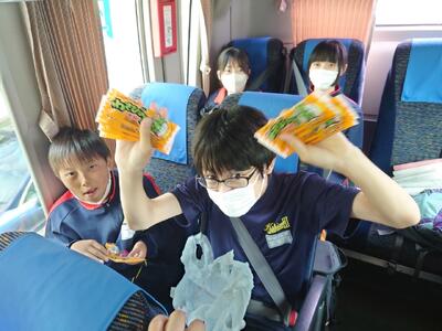 首都高速が混んでいていますが、車内はバスレクで盛り上がっています。渋滞の関係で、約30分遅れで最初の休憩の石川PAに到着しましたが、やはり混んでいて6台の大型バスを駐車するスペースがないため、号車ごとに別れて、談合坂SAで集合することに変更しました。お楽しみのおやつタイムが始まっています。