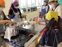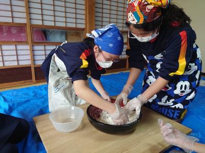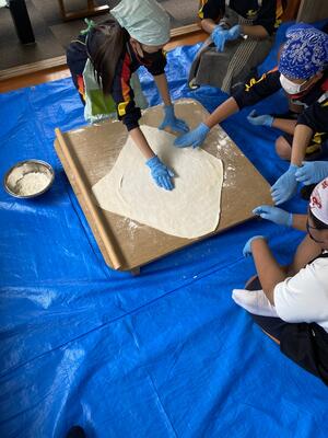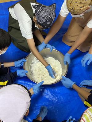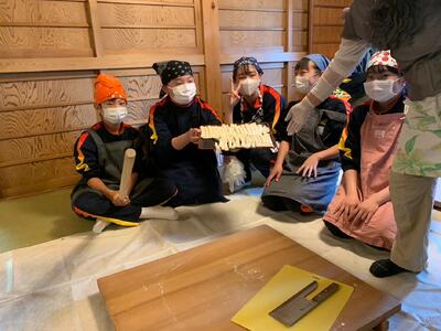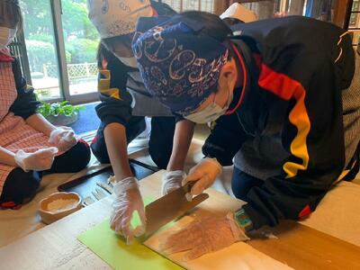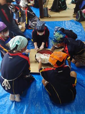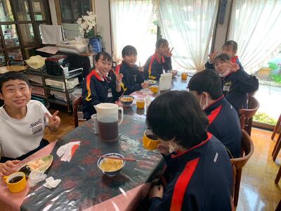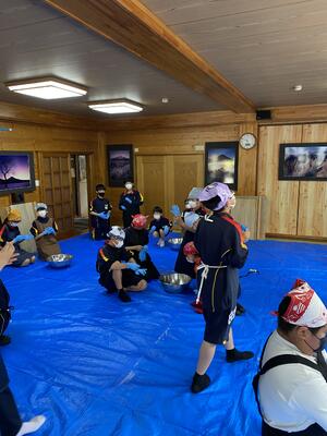 山梨県忍野村に到着しました。学級ごとに民宿に分かれて、ほうとう作りが始まりました。