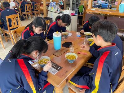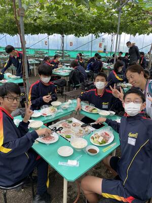 最後の昼食は御坂農園グレープハウスさんで、バーベキューです。学年を2つのグループに分けて、お土産とローテーションしました。お土産の一番人気は、何と言っても桔梗屋信玄餅。2つ入りのセットが750個も売れていました。その他、上限の5000円ギリギリまで、お土産を選んでいました。相変わらずの土砂降りですが、これで全ての日程を終え、帰校します。ホームページをご覧いただきありがとうございました。
