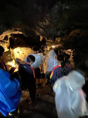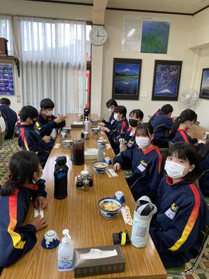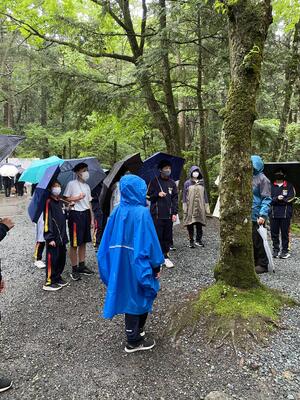 林間学校2日目は雨のスタートとなりました。このあとさらに強くなる予報。天気の状況を考慮して、風穴洞のみの見学として、帰校を1時間早めることにしました。朝ご飯をしっかり食べて出発します。