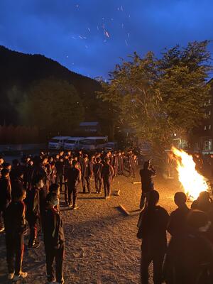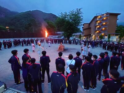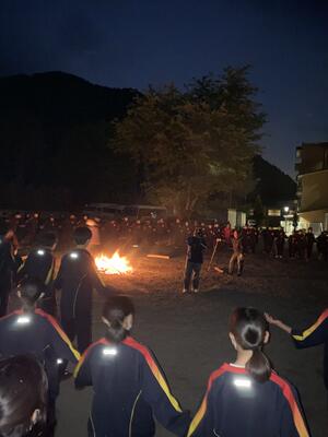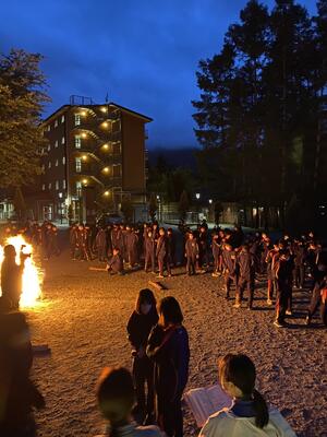 心配していた天気もなんとか持ち、キャンプファイヤーを実施することができました。オープニングのファイヤーセレモニーでは、趣向を凝らした演出で盛り上げてくれました。フォークダンスは、ジェンカ、マイムマイム、オクラホマミキサーと、どこかノスタルジックな選曲でしたが、楽しく踊っていました。