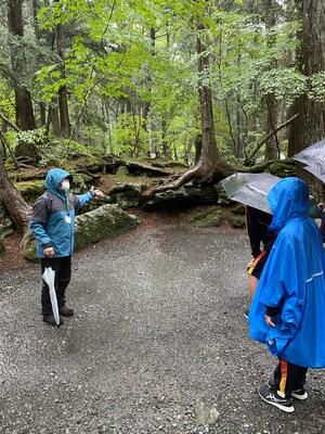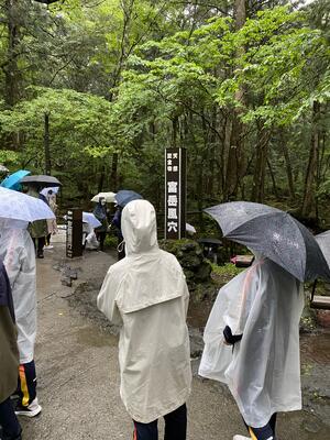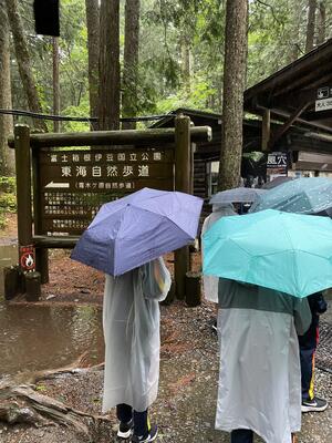 退館式を終え、バスに乗車しました。雨はどんどん強くなってきて土砂降りの状況です。樹海散策と氷穴は中止して、早めの帰校としたいと思います。雨の中、生徒たちはとても頑張っています。