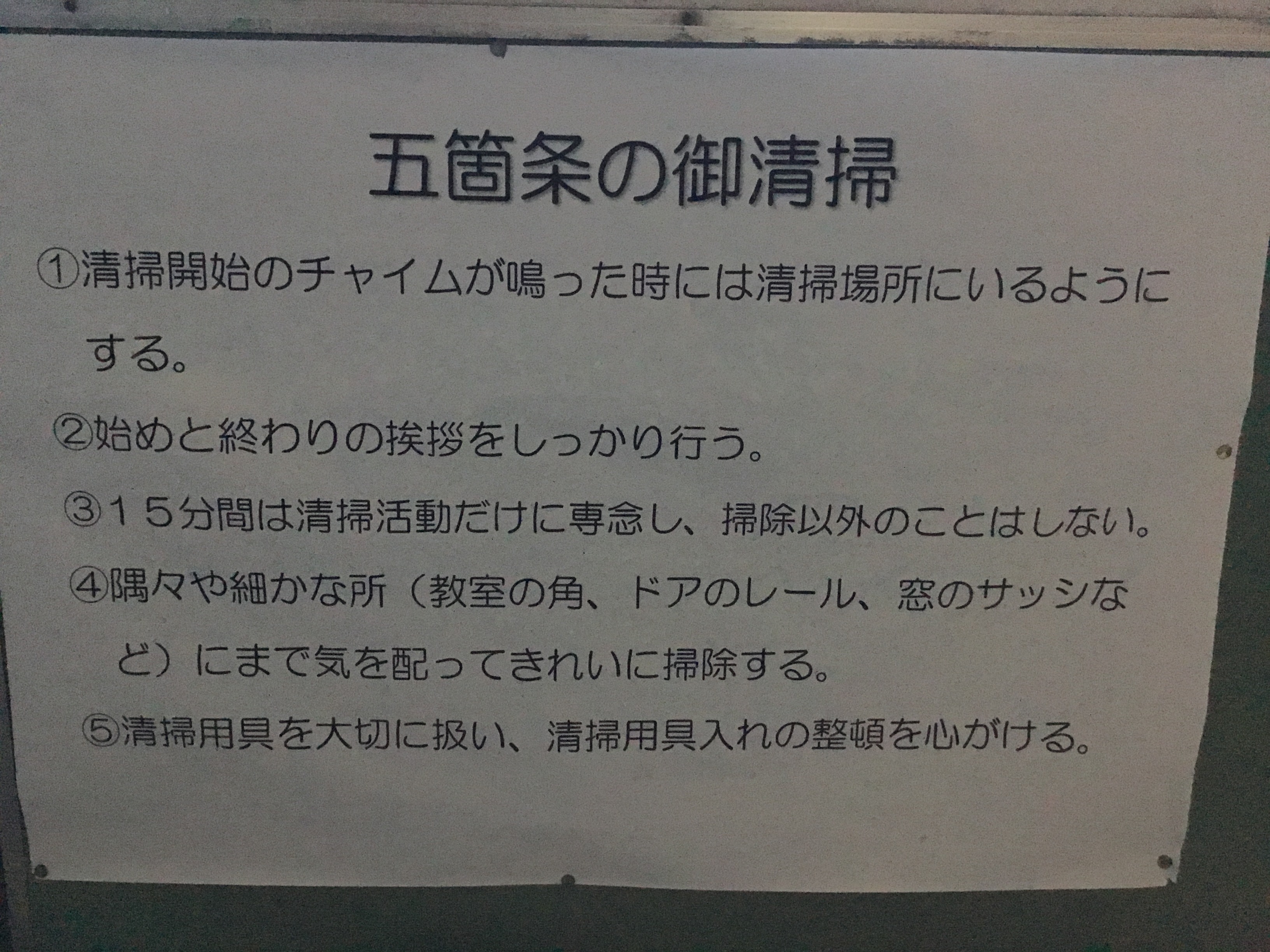 本校には「五箇条の御清掃」という、清掃に関するルールを定めた条文があります。