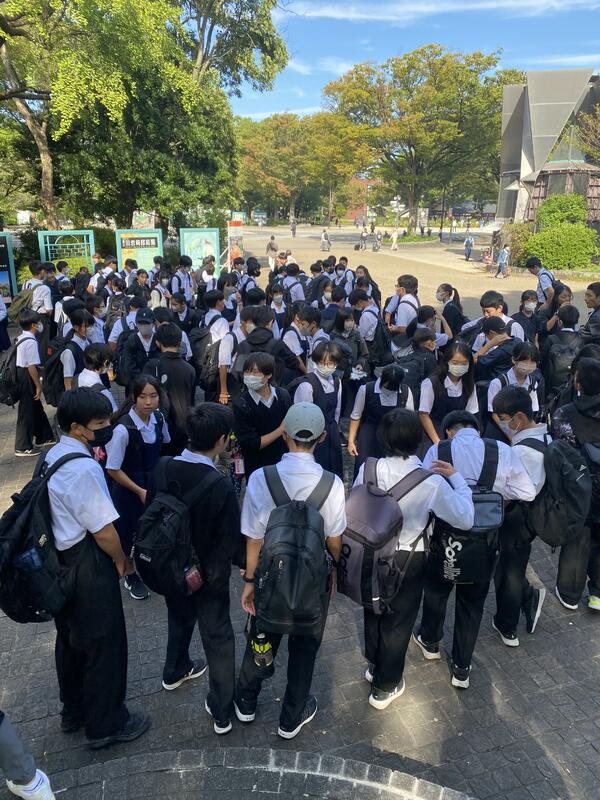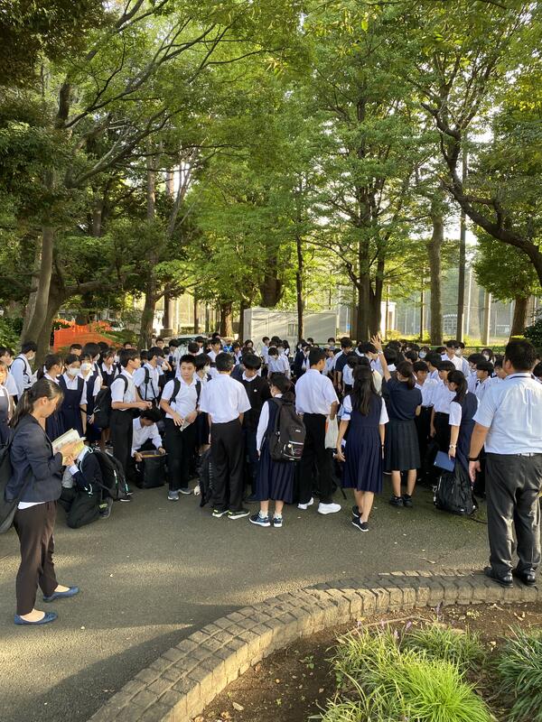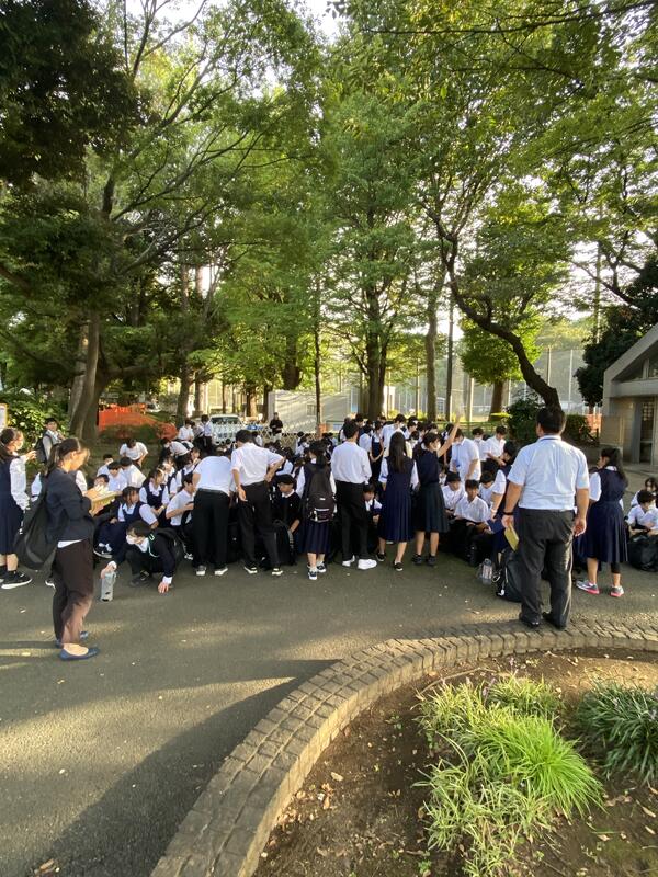 班別学習を終え、集合してきました。班ごとにチェックを受けて、スマホを回収します。体調不良もなく、みなさん元気です。
