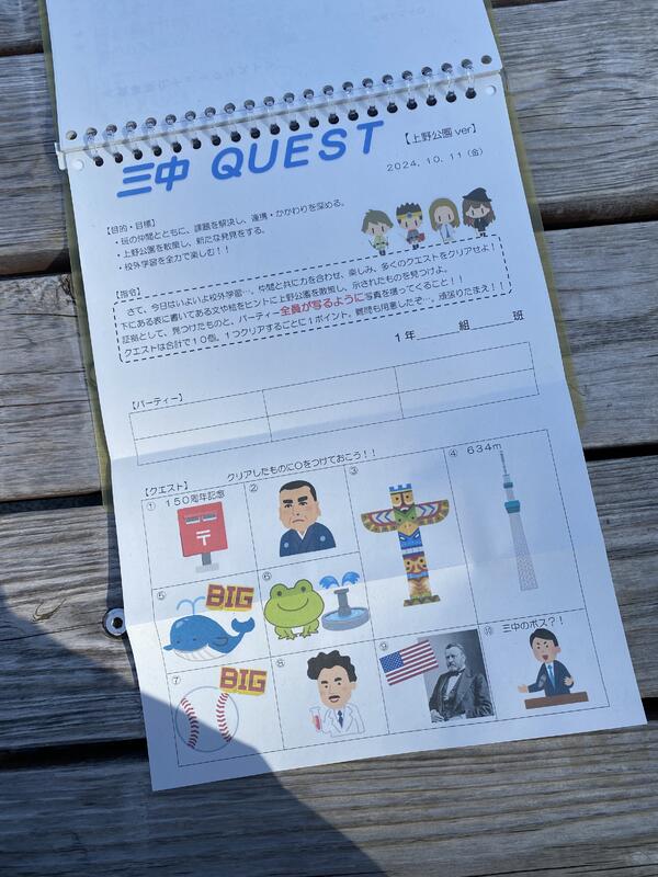 班別行動のミッションに三中QUESTがあります。公園内のある場所をヒントから見つけ出し、班員全員で写真をとるものです。課題は10個。いくつクリアできるでしょう?