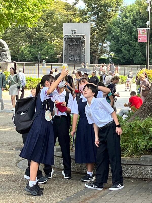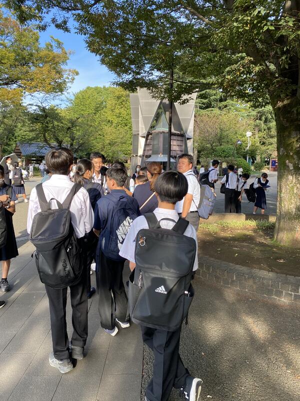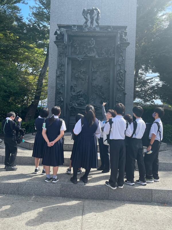 上野恩賜公園に到着しました。高野先生のチェックを班ごとに受けます。このあとクラス写真を撮って、班別行動の開始です。国立西洋美術館はモネ展が開催されており、開場前から行列ができています。