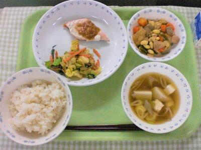 今日の献立は、和食です。主菜は、鮭の味噌漬け焼きです。今日の鮭は、秋鮭という秋にとれる鮭で、北海道や三陸でとれたものです。鮭には、様々な栄養があり、中でも、アスタキサンチンという鮭の赤い色素成分は、脳や目の健康維持、紫外線による肌への影響を防ぐ効果があります。他にも、記憶力アップのDHA、カルシウムの吸収を助けるビタミンD、貧血予防のビタミンB12など栄養たっぷりです。今日は、そんな鮭に手作りの味噌ダレをかけて仕上げています。タレもただ味噌をといたものではなく、にんにくや長ねぎなどが入れていて、風味よく作っています。白ご飯ともよく合うので、合わせてもりもり食べてもらえたらと思います。