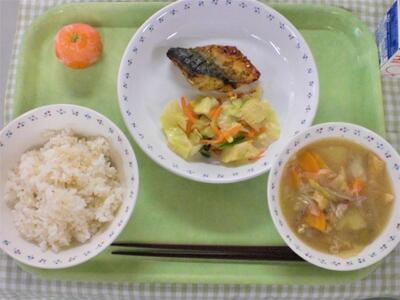 今日の献立は、和食です。主菜は鯖のカレー焼きです。鯖には記憶力アップのDHAや血液をサラサラにするEPAなど栄養たっぷり含まれています。今日はその鯖を使って、カレー焼きにしました。三中のカレー焼きのこだわりは、下味とタレの両方に、カレー粉をはじめとした特製のタレをたっぷり使っていることです。今日のカレー焼きも美味しくできたので、ご飯と一緒にもりもり食べてもらえたらと思います。