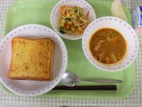 今日の献立は、洋食です。主食は、カラフルガーリックトーストです。にんにくがきいていることで、食欲を誘い、見た目もパプリカやパセリが入っていて彩りよくなっています。美味しく焼きあがったので、ぜひしっかり食べてもらえて思います。