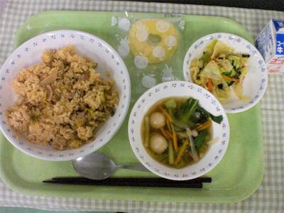 今日の献立は、中華です。主食はキムチ炒飯です。キムチ炒飯は、カレーにつぐくらいの人気メニューの1つです。給食のキムチ炒飯は、キムチ、豚肉、しめじと具材はシンプルですが、にんにくをたっぷり使っていて風味良く仕上がっていたり、豚肉はもも肉とバラ肉を合わせて豚肉の旨味を出していたりと工夫があります。今日のキムチ炒飯も丁寧に愛情込めて美味しく作ったので、もりもり食べてもらえたらと思います。