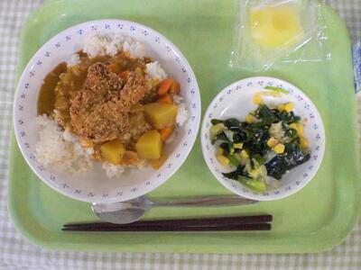 今日の主食は、カツカレーライスです。その理由は、本当に残念ながら、中止となってしまいましたが、本来なら明日が体育祭だったからです。今週はずっと体育祭に合わせたメニューを出していて、前日の今日は明日の体育祭本番に備えて、勝負に勝つ!自分に勝つ!という意味でカツカレーにしていました。体育祭はなくなってしまいましたが、給食だけでも体育祭の気分を味わってほしいと思ってそのままの献立にしています。2学期が始まり、そろそろ疲れもたまってくる頃だと思いますが、カツカレーを食べて、元気に学校生活を送ってほしいです。