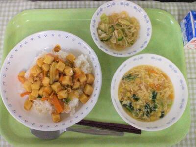 さて、今日の献立は、中華です。主食は、豆腐のチリソース丼です。そもそもチリソースとは、トマトをベースに塩、砂糖、香辛料などで味付けされたソースのことを言います。チリソースだけだと辛みが強くなってしまうため、他の調味料として、ケチャップ、砂糖、しょうゆなどを加えてとてもマイルドな辛さにし、かつご飯に合うしっかりめの味つけに仕上げています。白ご飯と相性抜群なので、どちらもたっぷりよそってもりもり食べてもらえたらと思います。