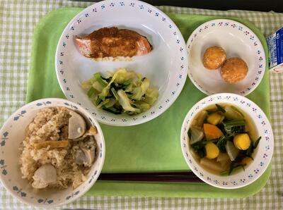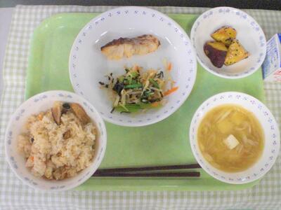 今日の献立は、秋を感じられる、旬を取り入れた和食です。主食は、きのこの秋おこわです。年間を通してスーパーなどにあるきのこ類ですが、自然なものは秋が旬です。今日はしめじと、しいたけを使い、さらに油揚げとにんじんを加えておこわを作りました。きのこの風味が香り、もちもちとした食感があって美味しく仕上がりました。