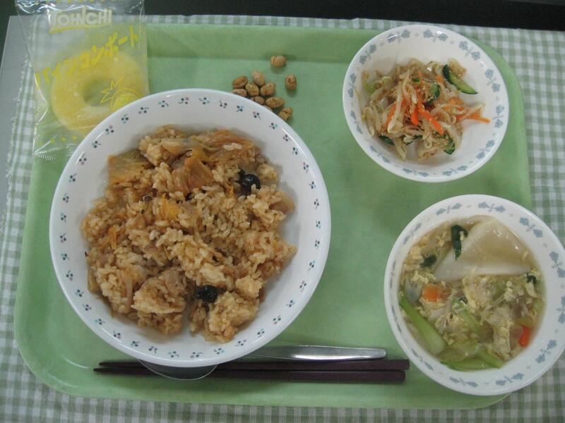 今日の献立は、中華です。主食はカレーを超える大人気メニュー、キムチ炒飯です。キムチ炒飯が美味しい秘密は、にんにくを使って香りをしっかりだし、お肉たっぷり使って炒めていること、そしてキムチのほんのりピリ辛な味が、食欲を誘うことだと思います。キムチには、乳酸菌と食物繊維が豊富に含まれており、ともに腸内を整える働きを持っています。また、たっぷり使っている豚肉には、ビタミンB1が多く含まれており、疲労回復効果などがあります。そんな栄養があり、美味しく仕上がったキムチ炒飯をぜひもりもり食べてくれたらと思います!