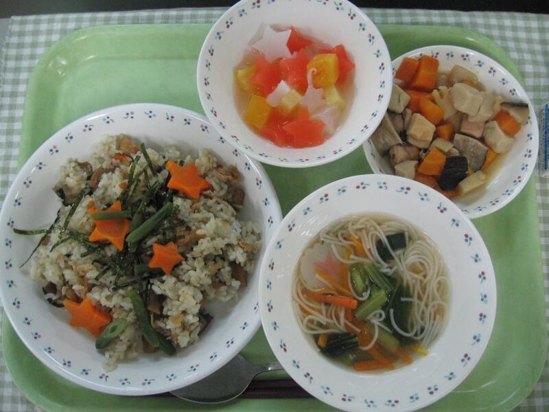 今日の献立は、日曜日が7月7日で、七夕ということで、七夕献立です。主食は、七夕ちらし寿司です。ご飯の上に星型人参をのせて仕上げました。星型が当たった人はラッキーです。また、実は汁物にも…デザートにも星が入っています。食べながら探してみてくださいね。