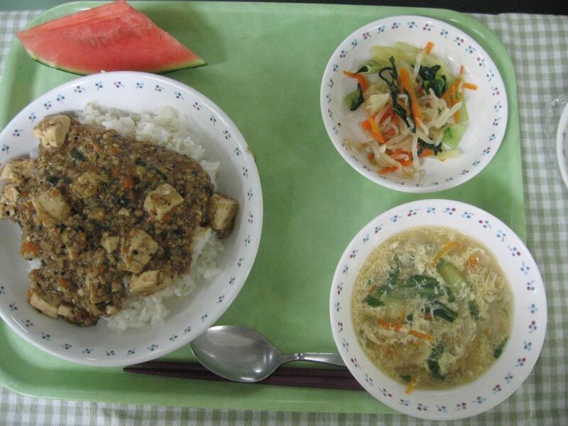 さて、今日の献立は、中華です。主食は、黒麻婆豆腐飯です。黒、とつくと激辛のイメージがわきますが、三中の黒麻婆豆腐飯は、黒ゴマを使っているため、「黒」とついています。普段の麻婆豆腐より、ごまが入ることで風味がよく、食べやすくなっています。食べなれないメニューかと思いますが、美味しく仕上がっているため、ご飯をしっかりよそり、たっぷりかけて食べてくれたらと思います。