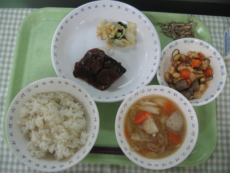 そして、副菜は五目豆です。一見名前を聞くと、5種類の食材が入っているのかなと思いますが、実はそうではありません。五目という意味は、5種類の栄養、バランスの良い、といった意味が込められています。今日の五目豆は、大豆、鶏肉、油揚げ、こんにゃく、にんじん、たけのこ、刻み昆布と7種類もの具材が入っています。いろいろな栄養がとれる一品になっており、だしがきいていて、これも美味しく仕上がりました。