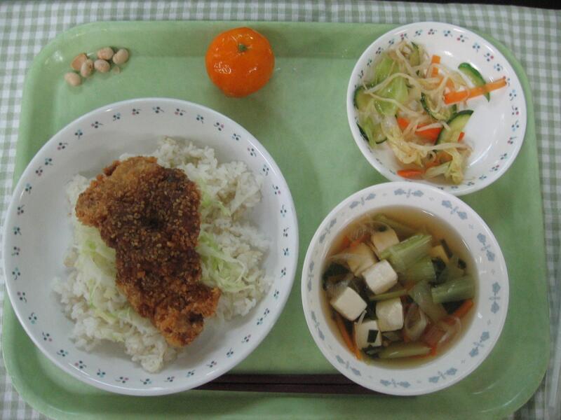 今日の主食は、みそ勝つ丼です。とんかつのカツと勝負に勝つの勝つをかけて献立名にしました。このカツは揚げるだけの冷凍ものではなく、生の豚肉をつかって、下味をつけ、薄力粉を水でといたドロをつけ、パン粉をつけて、サックリと油で揚げています。1枚作るだけでも手間がかかっているのですが、これを440枚程度作っています。とても時間と手間がかかっています。これも全て、みんなを応援する気持ちから頑張って調理員さんが作ってくれています。その気持ちにこたえて、みなさんもしっかり給食を食べてくれたらと思います。