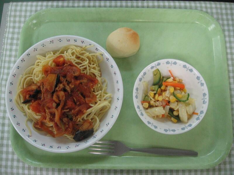 さて、今日の給食は洋食です。主食は、なすとトマトの夏パスタです。夏、というのは、トマトやなす、ピーマンなど夏野菜をたっぷり使って仕上げているからです。
