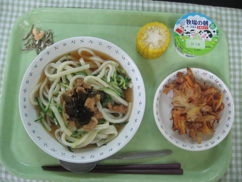 あいにくの雨ながら、今日の献立は冷やしうどんです。去年もこの時期に出したのですが、そのときは毎日とても暑く、氷が入ったうどんはひんやりしていてピッタリでした。今日はとても暑い…とまでは、いかず、室内がもわっとする感じ程度ですが、ひんやりしたうどんを味わってもらえたらと思います。また、かき揚げも一つ一つ手作りで、丁寧に作りました。味付けはしていないので、うどんの汁にひたしながら、麺と一緒に食べてくれたらと思います。