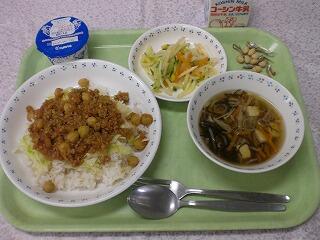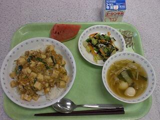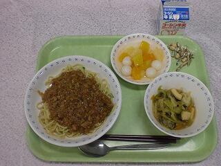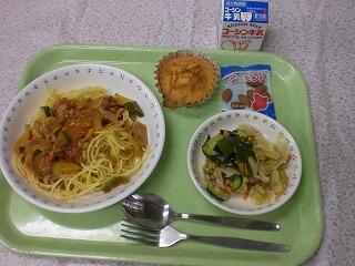 給食では、ナスやズッキーニ、ピーマンを入れてスパゲティのソースにしました。