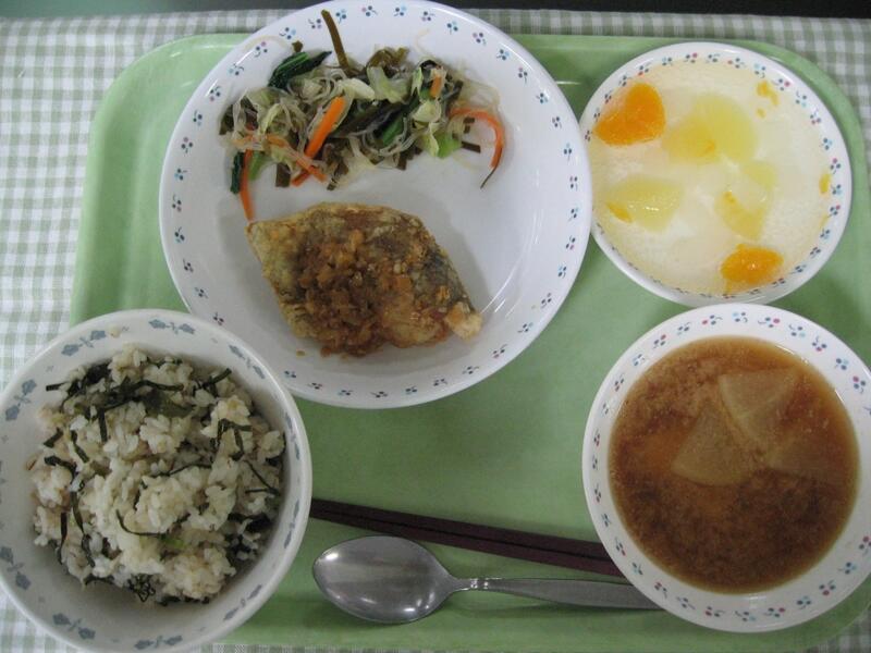 今日の給食は、和食です。主菜は鯖の立田揚げです。立田揚げとは、肉や魚の臭みをとり、じっくり漬け込んで、それを片栗粉で揚げたもののことを言います。ちなみに、似ているから揚げの場合は、野菜なども使うことがあり、小麦粉で揚げるものになります。今日は、鯖をにんにく、しょうが、酒、しょうゆにつけこんで、片栗粉をつけ、サックリ揚げて作りました。下味で魚のくさみを抑え、揚げたことで、お肉っぽいような食べやすい鯖になっています。ぜひ食べてくれたらと思います!