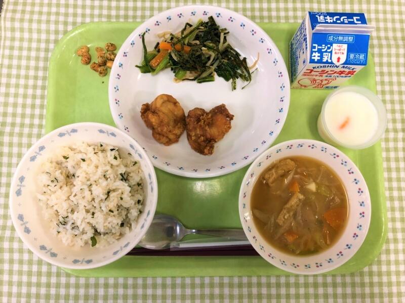 いよいよ明日から林間学校です。そのため、今日は、林間で行く長野県を意識した林間へいってらっしゃい献立です。まず主食は、長野県の名物、野沢菜を使った野沢菜ごはんです。野沢菜としらすをご飯に混ぜ合わせました。野沢菜のほどよい塩気でご飯がすすみます。ぜひもりもり食べてくださいね!