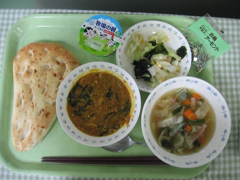 今日の給食は洋食です。主食は、ほうれん草と豚肉のドライカレー&ナンです。普段、カレーといえばカレーライスを思い浮かべるかと思いますが、今日はドライカレーにしました。今日一緒に食べる「ナン」は、みなさん食べたことがあるでしょうか?インドなど中央アジアで広く食べられており、起源は約7000~8000年前と言われ、最初に作られたパンではないかと考えられています。今日のナンは学校にきたものを再度焼き上げて仕上げました。