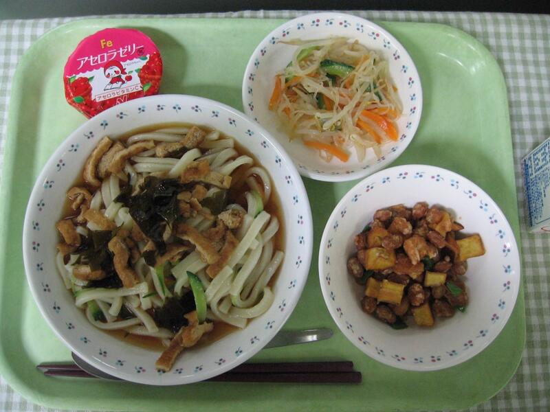 今日の献立の主食は冷やし狐(きつね)うどんです。きつねうどんとは何か知っていますか?きつねうどんとは、甘辛く煮た油揚げがのっているものになります。きつね、という名前の由来は、きつねの好物が油揚げ、という言い伝えから来ているそうです。本当かはわからないそうですが、昔きつねにいろいろなものをお供えした人が、きつねが真っ先に油揚げを食べたのを見て、好物だと思い込んだという説があるそうです。